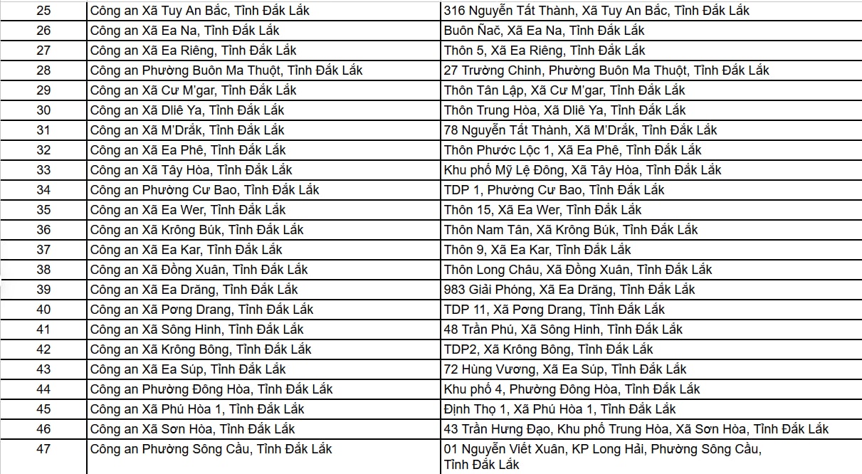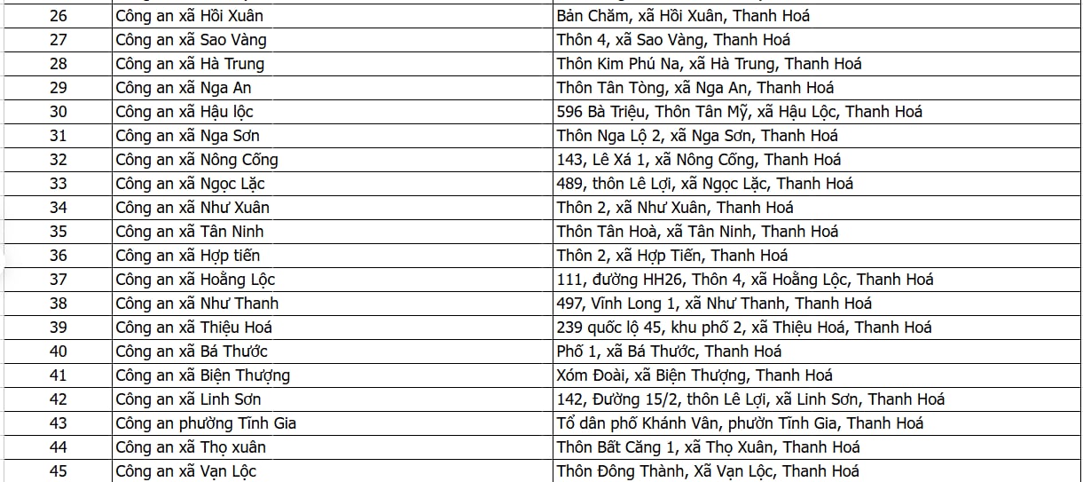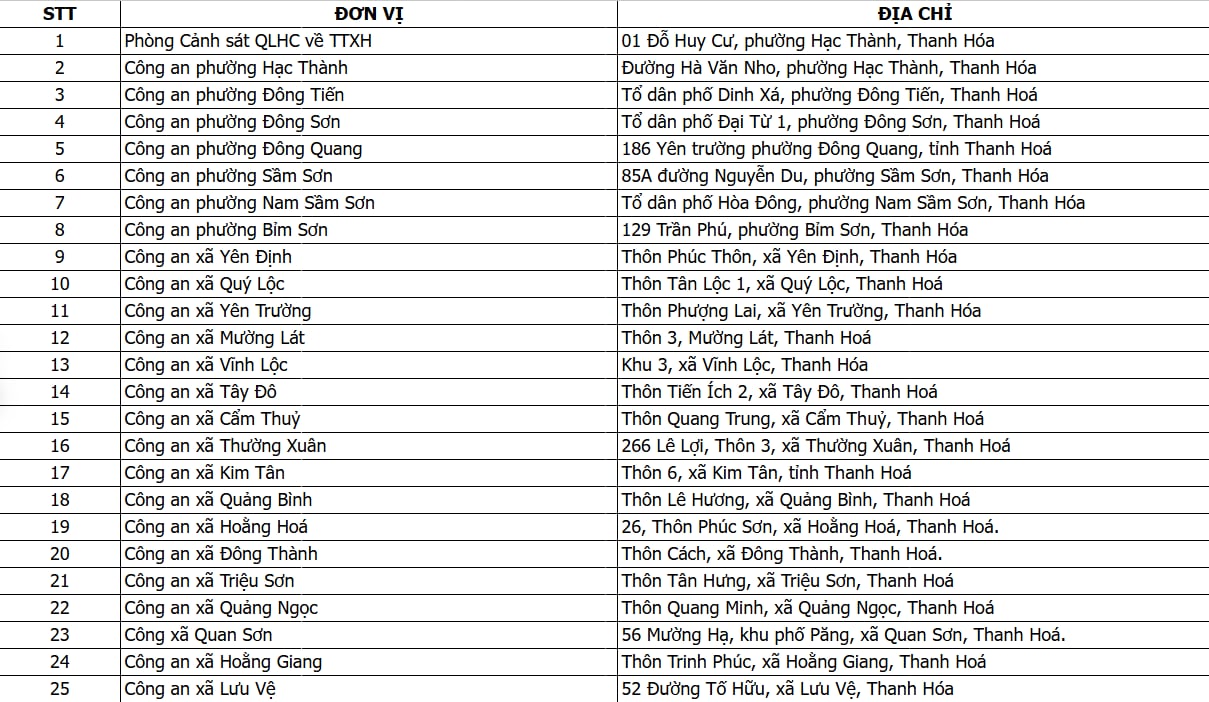 Đối với những công dân có nhu cầu cấp Thẻ Căn cước, lực lượng Công an Thanh Hóa sẽ bố trí tại trụ sở 45 đơn vị Công an cấp phòng, cấp xã như sau:
