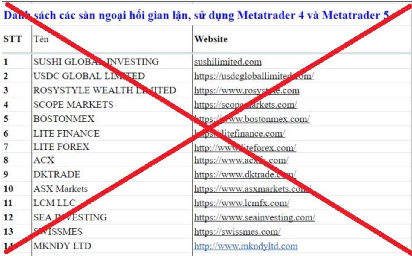 Danh sách các sàn giao dịch lừa đảo sử dụng nền tảng giao dịch MT4, MT5. (Ảnh: Công an tỉnh Lào Cai)