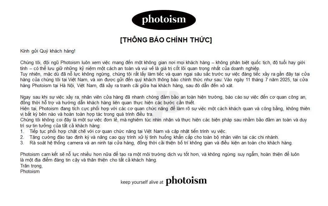 Sau khi sự việc được đưa lên mạng, tiệm photobooth đã đăng tải thông báo trên fanpage, xác nhận có xảy ra va chạm giữa khách nước ngoài và khách Việt Nam. Cửa hàng cho biết đã can thiệp, báo công an và liên hệ với đại sứ quán Hàn Quốc để đề nghị hỗ trợ chi phí khám bệnh cho nạn nhân.