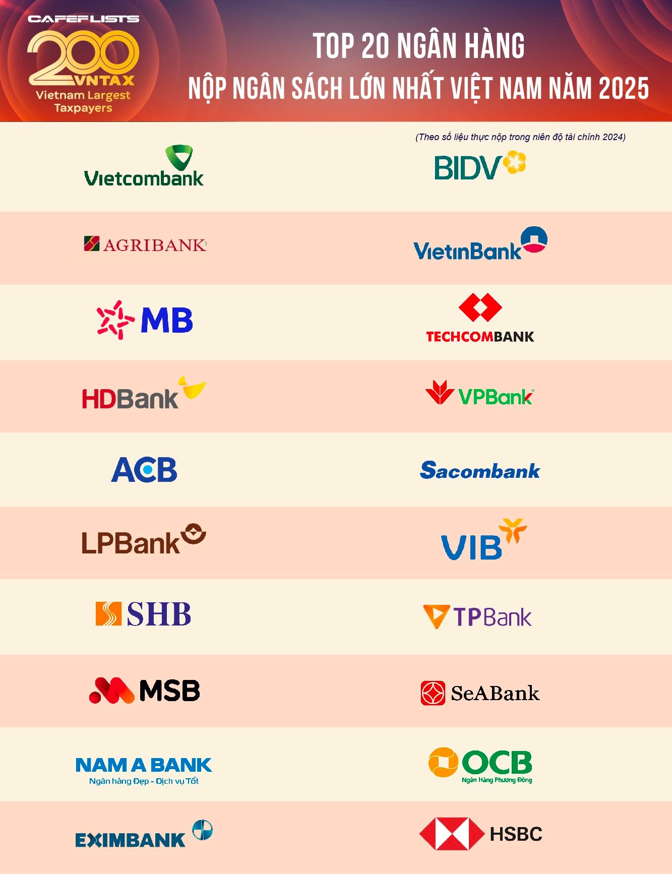 Dựa trên dữ liệu thực nộp trong năm tài chính 2024 từ các nguồn công khai và xác thực, danh sách Top 20 được sắp xếp theo thứ tự giảm dần, với sự thống trị của nhóm "Big4" ngân hàng thương mại nhà nước và sự trỗi dậy mạnh mẽ của các ngân hàng tư nhân.