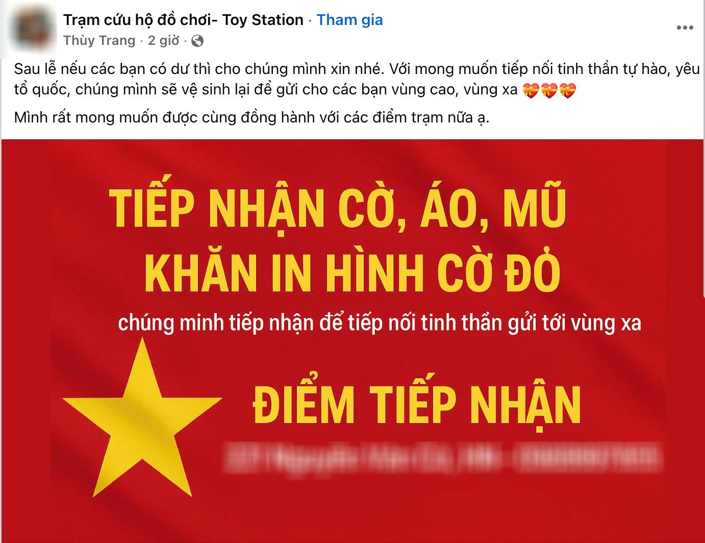 Nhận thấy cơ hội này, chị T.T., thành viên nhóm "Trạm cứu hộ đồ chơi - Toy Station" đã kêu gọi cộng đồng tiếp nhận những vật phẩm dư thừa tại Hà Nội và gửi tới các vùng cao, vùng xa, nhằm lan tỏa tinh thần yêu nước đến những nơi còn khó khăn.