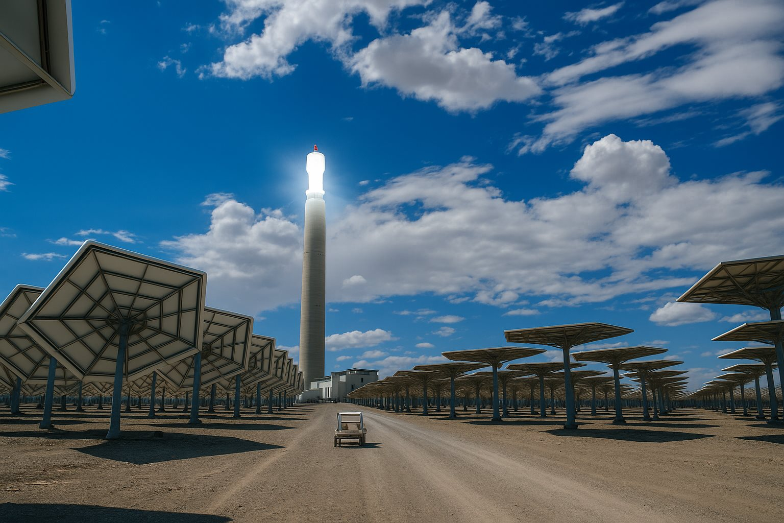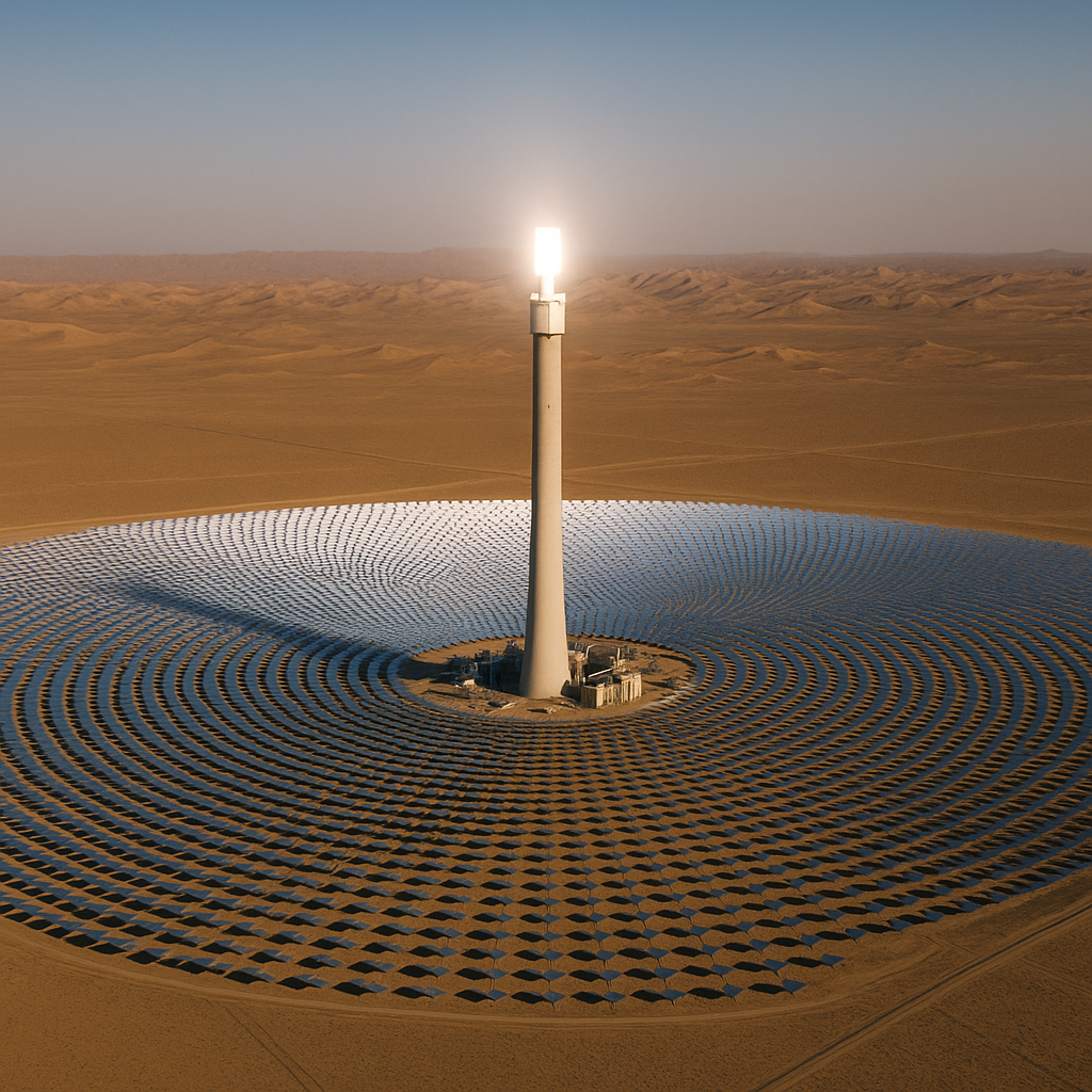 Khác với pin mặt trời truyền thống, hệ thống gồm hàng chục nghìn tấm gương này luôn xoay theo ánh nắng, tập trung nhiệt lên đỉnh tháp. Tại đó, ánh nắng được chuyển hóa thành nhiệt độ hơn 560°C, đun nóng hỗn hợp muối nitrat đặc biệt. Muối nóng này sau đó được dẫn vào các bể cách nhiệt dưới mặt đất và có thể giữ nhiệt đến 15 tiếng, đủ để quay tuabin phát điện xuyên đêm mà không cần thêm nhiên liệu.