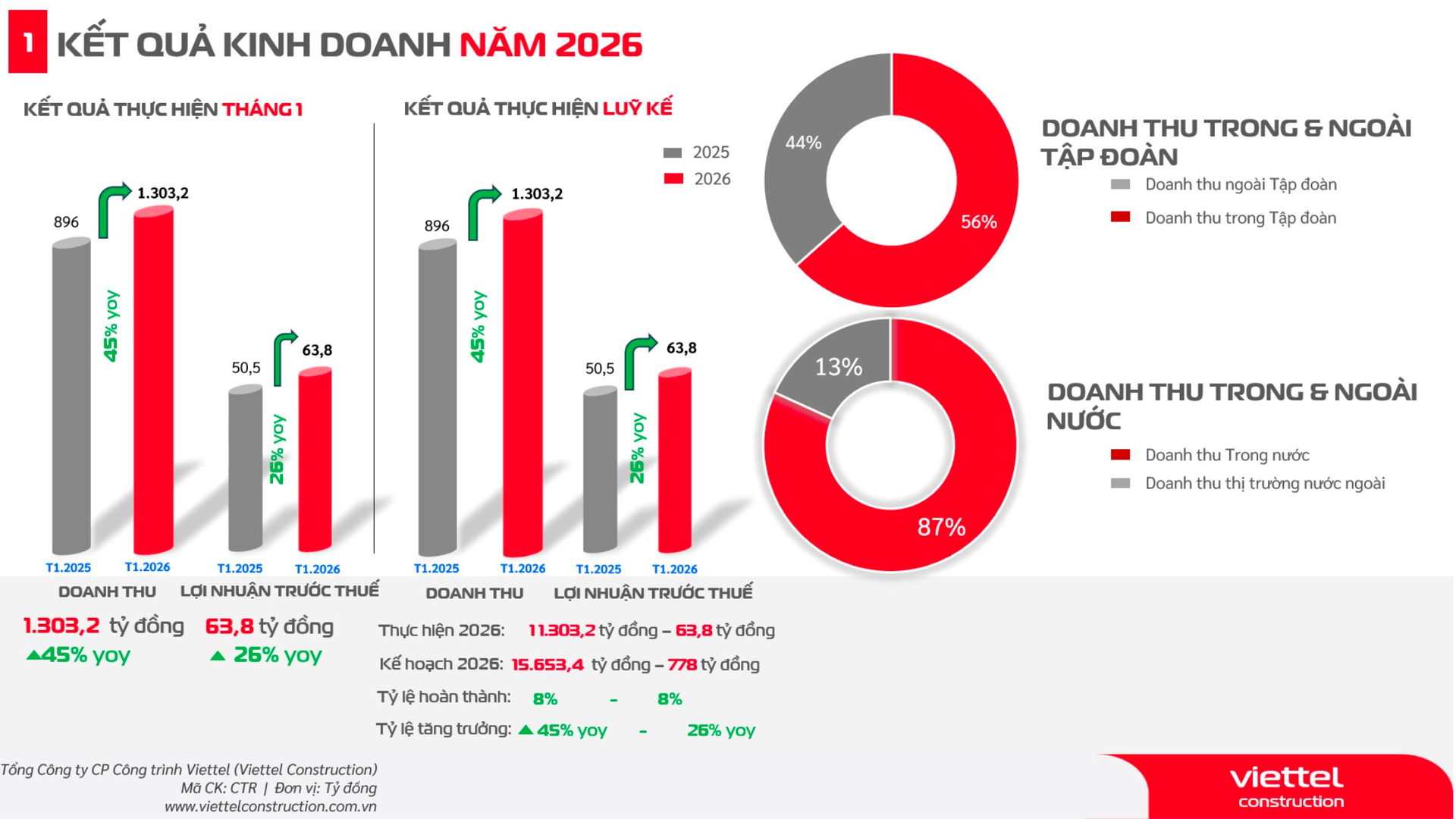Theo báo cáo cập nhật mới nhất, Tổng CTCP Công trình Viettel (Viettel Construction, mã CK: CTR) khởi động năm 2026 với kết quả kinh doanh khả quan. Riêng tháng 1, doanh thu đạt 1.303 tỷ đồng, tăng 45% so với cùng kỳ 2025; lợi nhuận trước thuế đạt gần 64 tỷ đồng, cao hơn 26%.