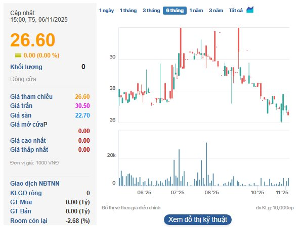 Cổ phiếu MH3 đang giao dịch quanh vùng 26.600 đồng (ngày 06/11/2025) với khối lượng khớp lệnh trung bình 10 phiên chỉ đạt 2.300 cổ phiếu.