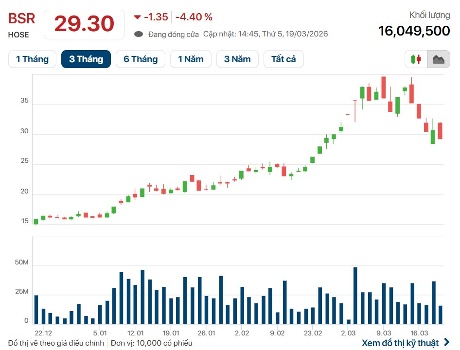 Kết phiên 19/3, cổ phiếu BSR có giá 29.300 đồng/cp, giảm 4,4% so với phiên trước đó. Vốn hóa thị trường đạt 146.000 tỷ đồng.