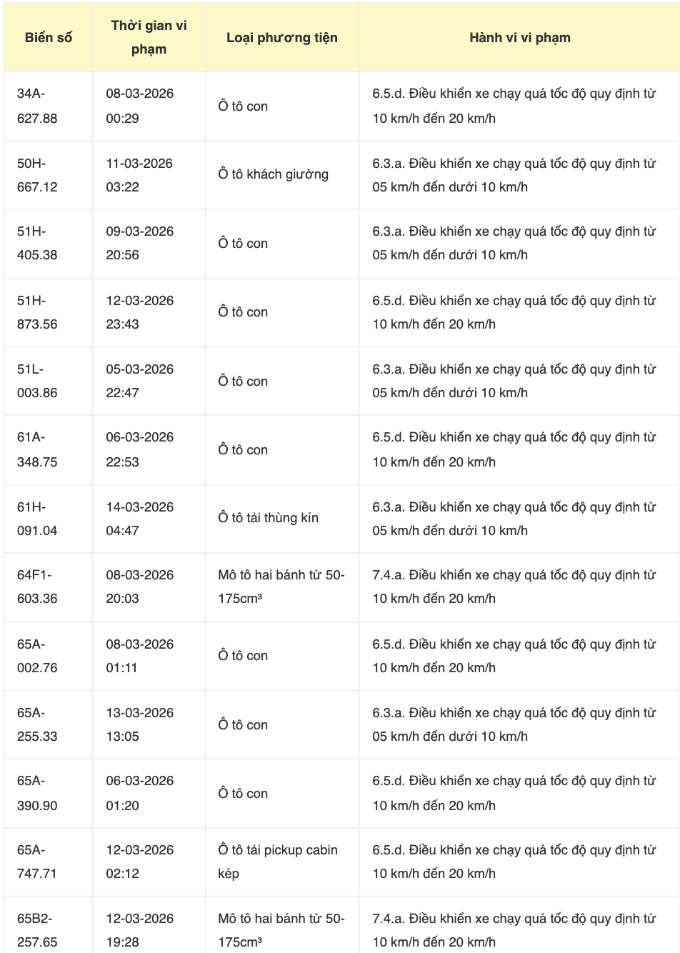 Trong danh sách do lực lượng chức năng công bố, hầu hết các trường hợp vi phạm đều liên quan đến hành vi điều khiển phương tiện vượt quá tốc độ cho phép.