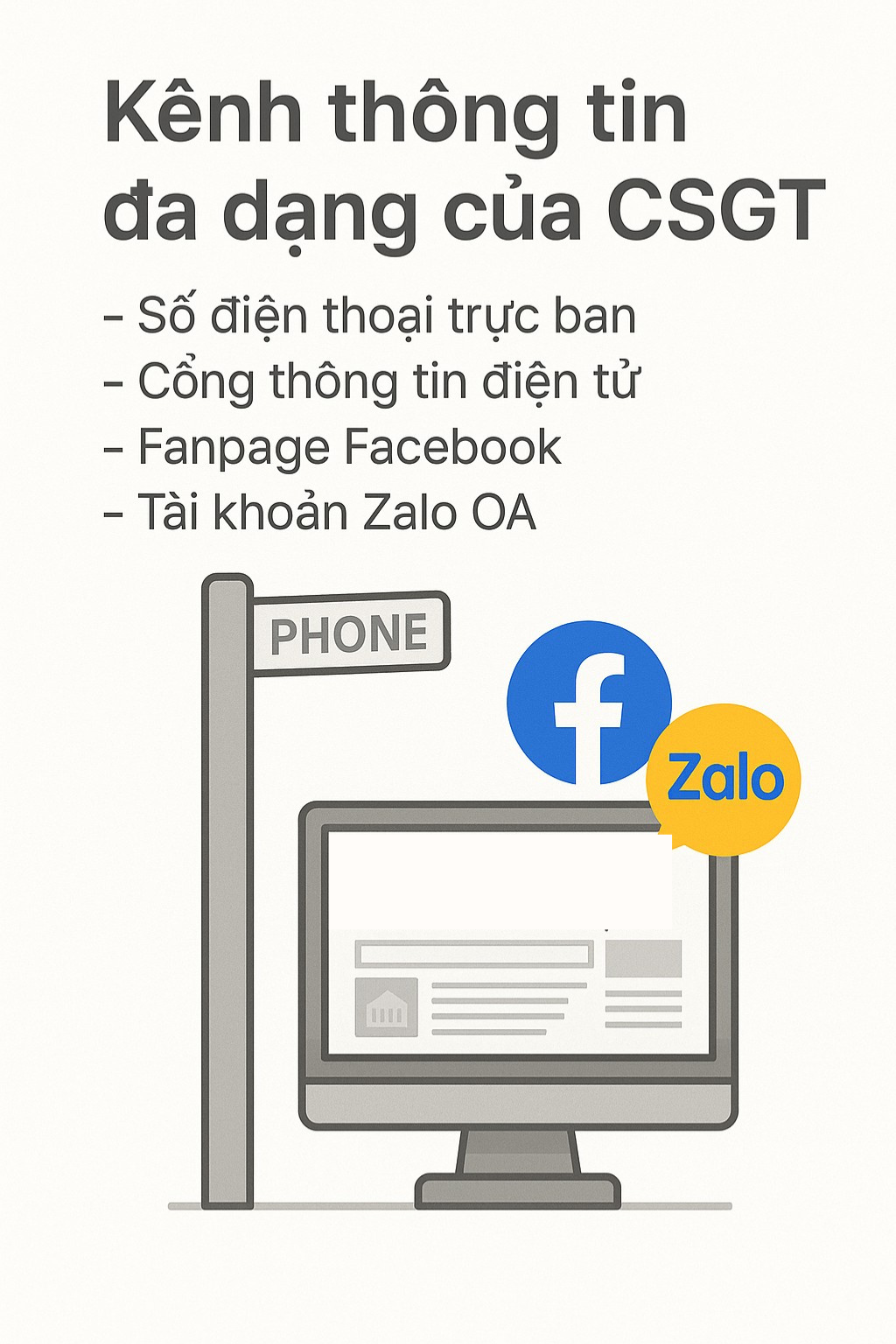 Bên cạnh đó, Cục CSGT cùng Phòng CSGT Công an các tỉnh, thành phố vẫn duy trì các kênh tiếp nhận thông tin khác như số điện thoại trực ban; Cổng thông tin điện tử; Fanpage chính thức trên nền tảng Facebook; tài khoản Zalo OA…