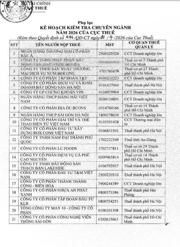 Cục Thuế công bố danh sách 108 doanh nghiệp trong kế hoạch kiểm tra năm 2026: Có những doanh nghiệp lớn nào?