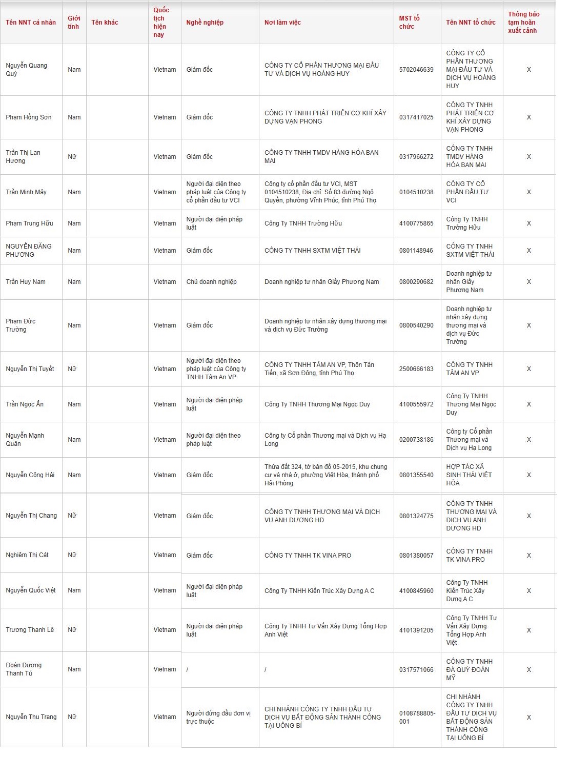 Danh sách người nộp thuế bị thông báo tạm hoãn xuất cảnh gồm: