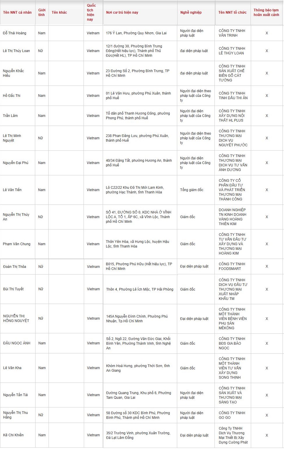 Danh sách người nộp thuế bị thông báo tạm hoãn xuất cảnh gồm: