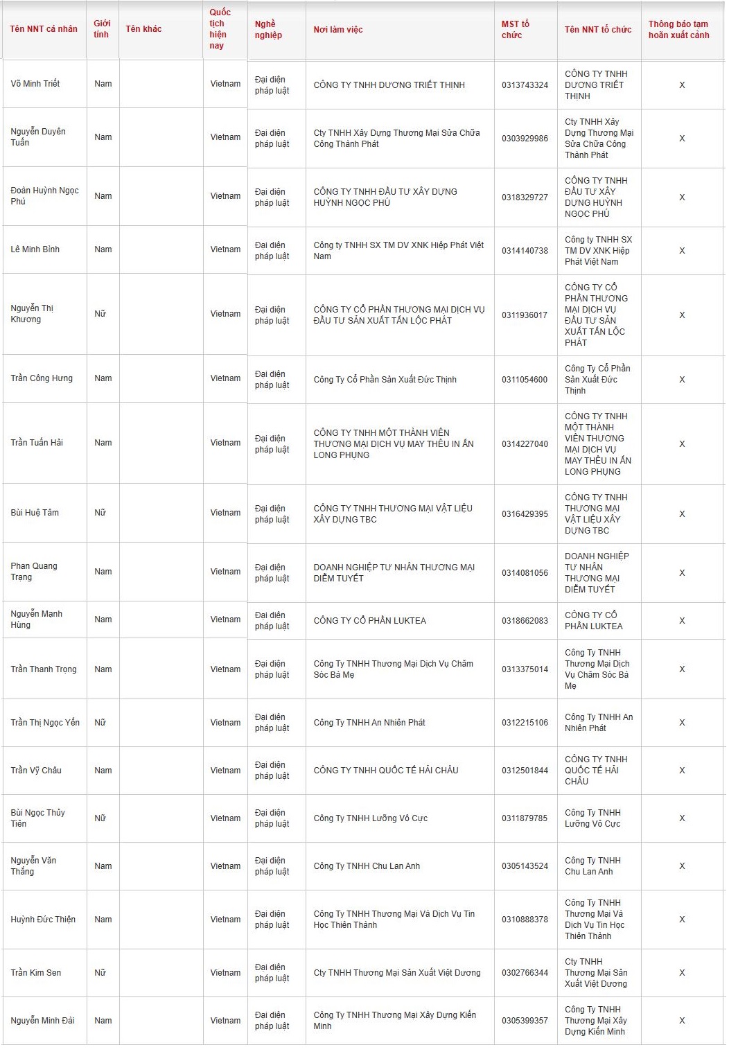 Danh sách người nộp thuế bị thông báo tạm hoãn xuất cảnh gồm: