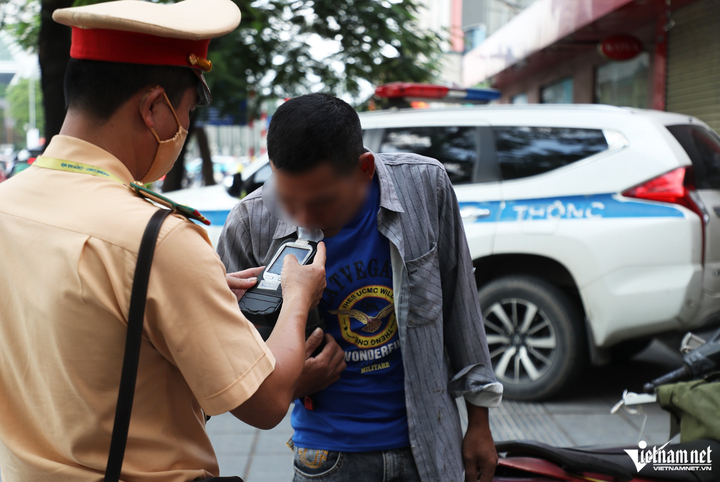 Đội CSGT đường bộ số 6 (Phòng CSGT Công an Hà Nội) kiểm tra nồng độ cồn. (Ảnh: Đình Hiếu)
