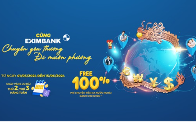 Cụ thể, từ ngày 01/03/2024, Eximbank triển khai chương trình ưu đãi phí "Cùng Eximbank chuyển yêu thương – Đi muôn phương" với mong muốn dành những ưu đãi tốt nhất để khách hàng gửi trọn yêu thương đến người thân ở khắp nơi trên thế giới và trải nghiệm hoàn hảo về dịch vụ thanh toán quốc tế của Eximbank.