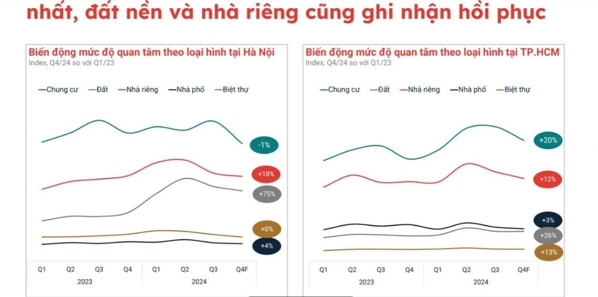 Chia sẻ mới đây, đại diện Batdongsan.com.vn cho hay, thị trường bất đông sản đã vượt qua giai đoạn khó khăn, đang chuyển giao để bước vào chu kì tăng trưởng. Dù thách thức vẫn còn song các chỉ số quan tâm của người mua đến các phân khúc đã phục hồi rõ nét. Riêng phân khúc đất nền sẽ có đà khởi sắc vào giữa năm 2025. Khi đó, hoạt động mua bán cũng như mức độ tăng giá sẽ trở lại mạnh mẽ.