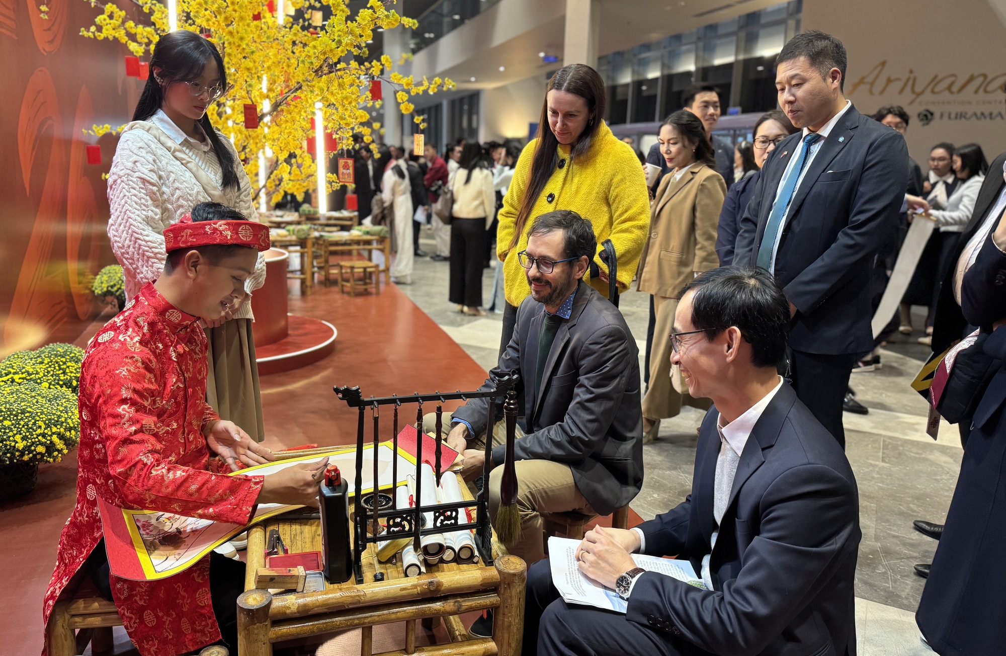 Đại diện các doanh nghiệp, nhà đầu tư tham quan không gian Tết Việt được tổ chức bên lề hội nghị