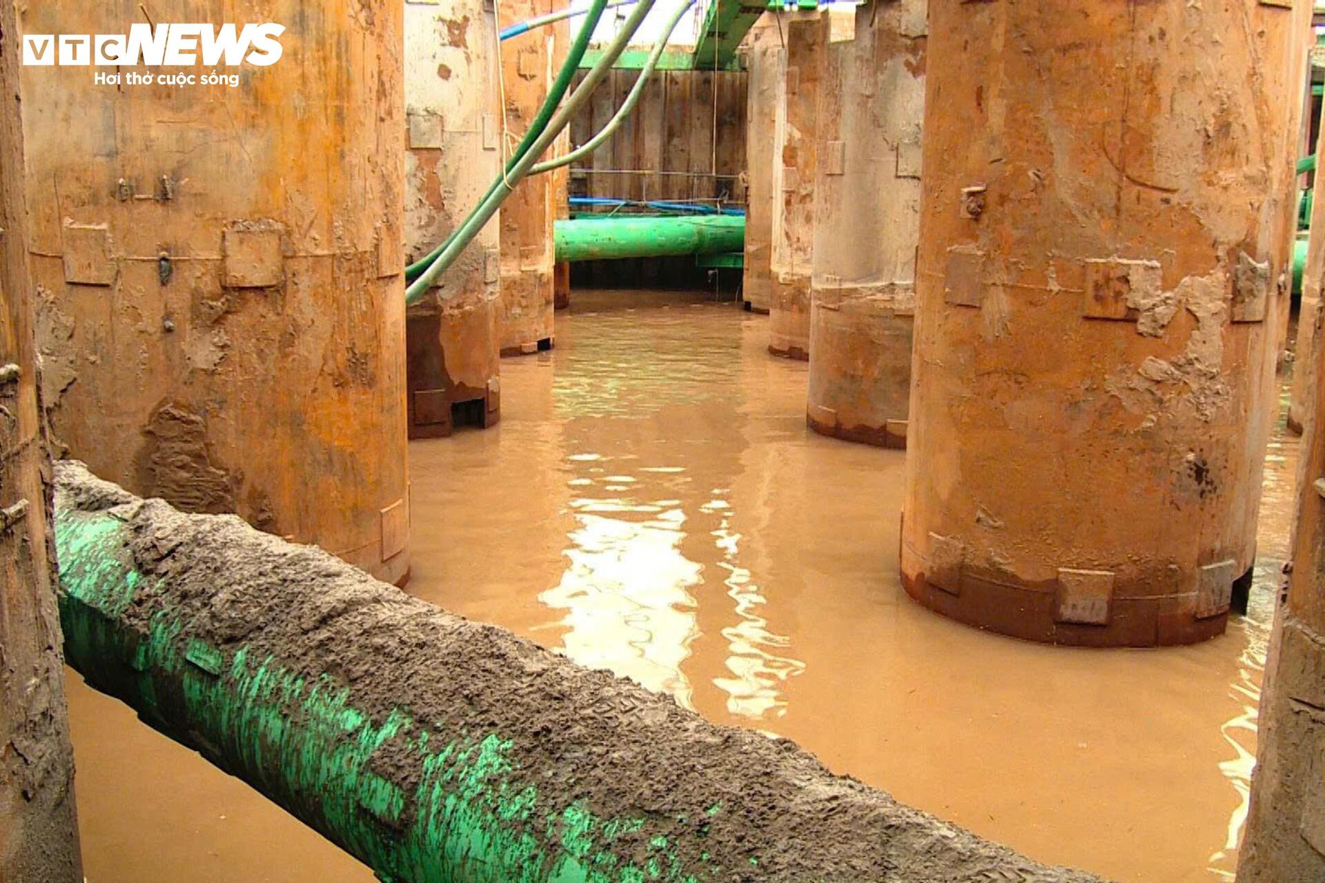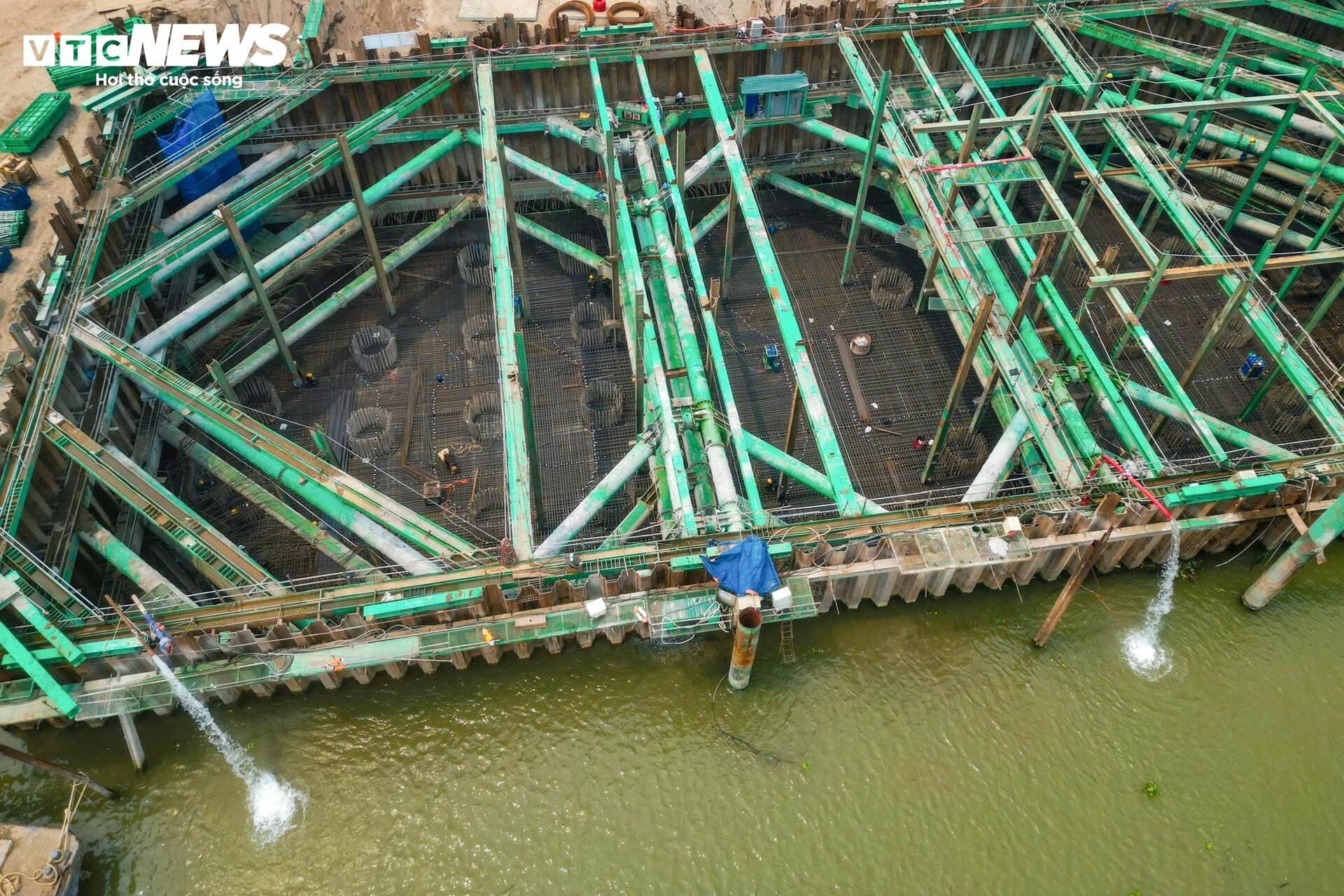 Ghi nhận tại công trường những ngày giữa tháng 4, nhiều hạng mục đang được triển khai đồng loạt. Trên sông, các sà lan vận chuyển vật liệu hoạt động liên tục, đưa cát, đá, xi măng đến vị trí thi công.