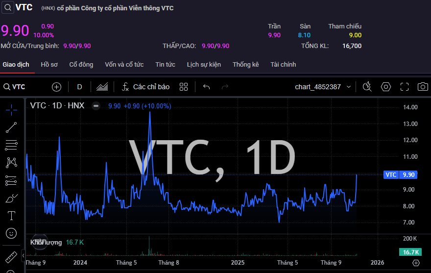 Trước bối cảnh đó, cổ phiếu VTC của CTCP Viễn thông VTC trên sàn HNX trở thành điểm sáng, thị giá đóng cửa phiên “nhuộm sắc tím” lên mốc 9.900 đồng/cp. Đây cũng là vùng giá cao nhất trong gần 1,5 năm qua của VTC, kể từ tháng 6/2024. Thanh khoản cải thiện đáng kể với 16.700 cổ phiếu được sang tay, vượt xa mức chỉ vài trăm đến vài nghìn đơn vị của nhiều phiên trước đó, thậm chí VTC từng xuất hiện không ít phiên gần như “đóng băng” thanh khoản.
