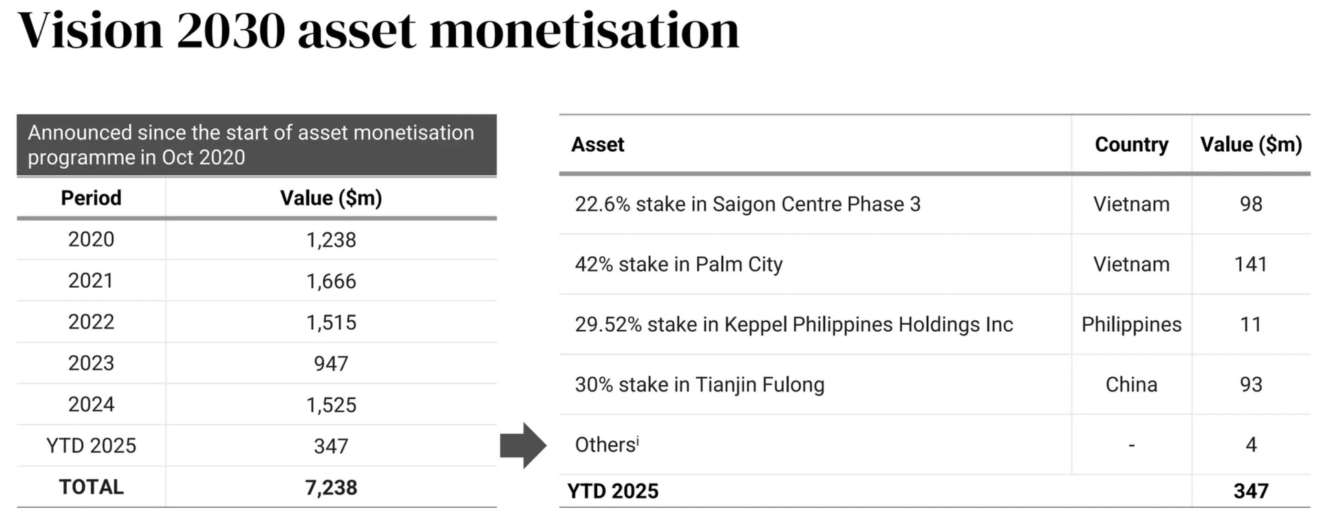 Việc liên tục thoái vốn nhằm phục vụ "kế hoạch đầy tham vọng" của Keppel: Thu hồi tổng cộng 10-12 tỷ SGD (tương đương 7,4-8,9 tỷ USD) từ các tài sản, đến cuối năm 2026.