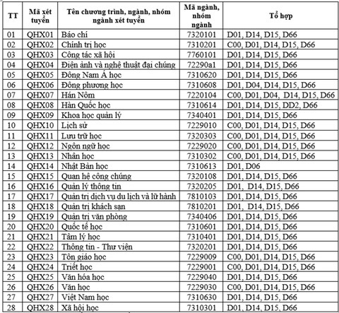 Trường chỉ xét tuyển khối C00 ở một số ngành như: Chính trị học, Hán nôm, Lịch sử, Lưu trữ học, Ngôn ngữ học, Nhân học, Văn học, Tôn giáo học, Triết học.