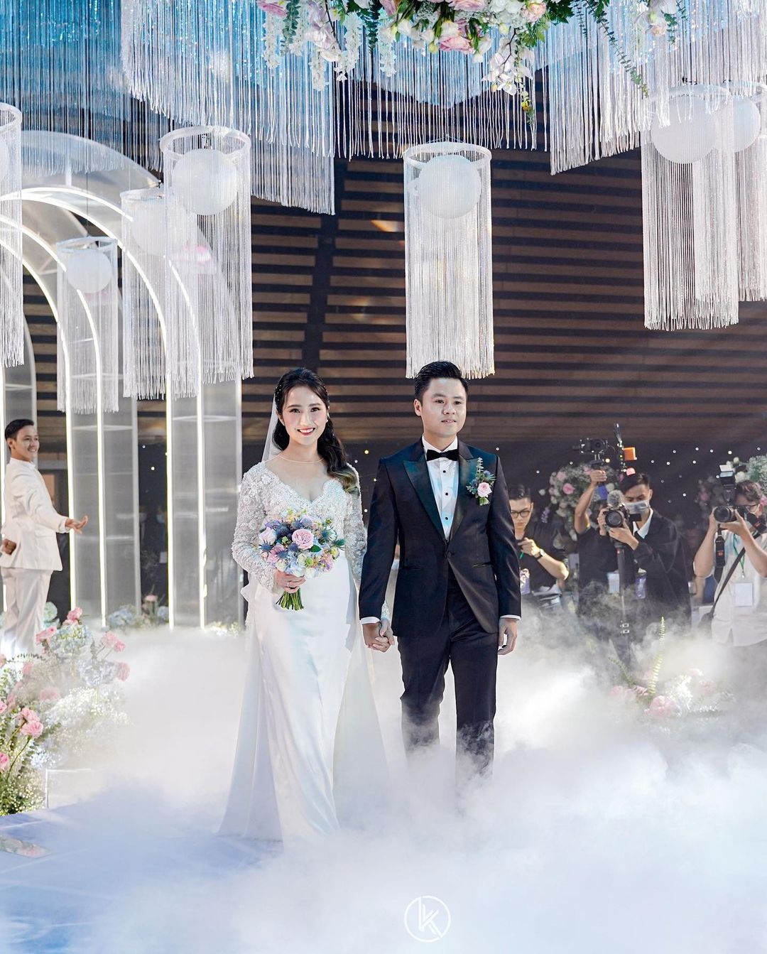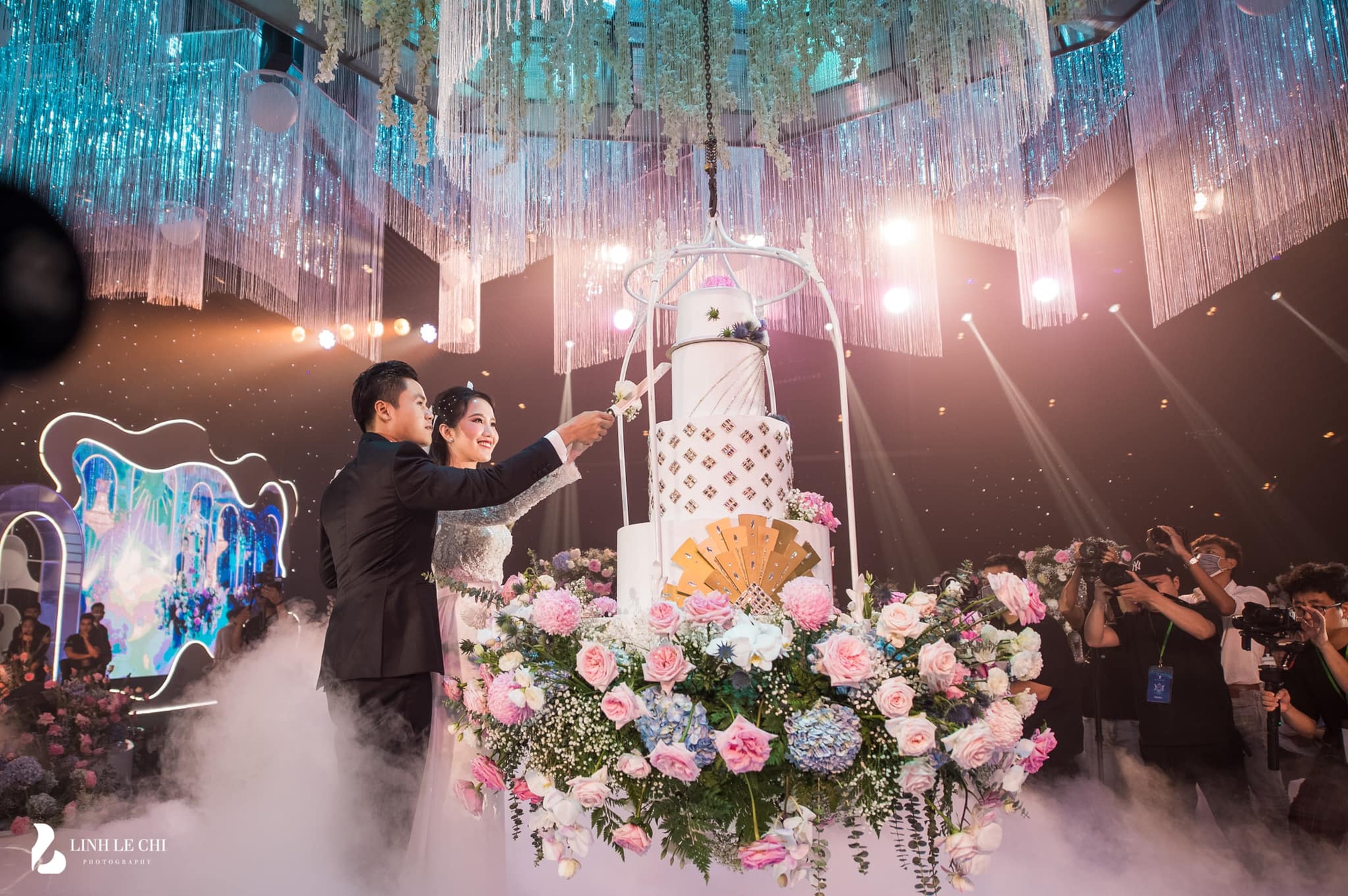 Tiếp đó, đám cưới của cặp đôi được tổ chức tại khách sạn sang trọng ở TP.HCM. Từ sảnh đến lễ đường tràn ngập toàn hoa tươi, mỗi một góc đều phủ lên tone màu yêu thích của cô dâu là xanh dương. Siêu đám cưới của cặp đôi khiến nhiều người phải choáng ngợp với tổng chi phí lên tới 20 tỷ đồng. Chỉ tính riêng không gian tiệc cưới được hé lộ có chi phí lên tới 10 - 12 tỷ đồng.