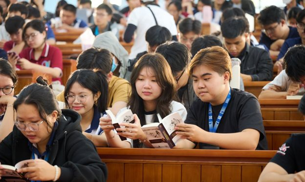 Đông đảo sinh viên chăm chú lắng nghe những bài học về thất bại, bản lĩnh vượt khó và khát vọng vươn lên được chia sẻ từ các đầu sách trong Tủ sách Nền tảng Đổi đời tại chương trình Hành trình Từ Trái Tim.