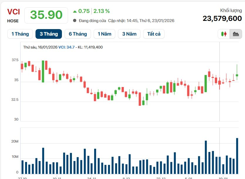 Trên thị trường chứng khoán, phản ứng tích cực trước chuỗi thông tin hỗ trợ, cổ phiếu VCI đã có phiên giao dịch sôi động ngày 23/1. Kết phiên, thị giá VCI tăng 2,13% lên mức 35.900 đồng/cổ phiếu.