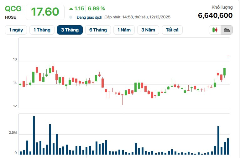 Cổ phiếu Công ty Cổ phần Quốc Cường Gia Lai (QCG) ghi nhận chuỗi 3 phiên tăng hết biên độ liên tiếp vào các ngày 10, 11 và 12/12. Kết thúc phiên giao dịch ngày 12/12, thị giá đạt 17.600 đồng/cổ phiếu, tăng 21,7% so với mức giá đóng cửa phiên ngày 9/12.
