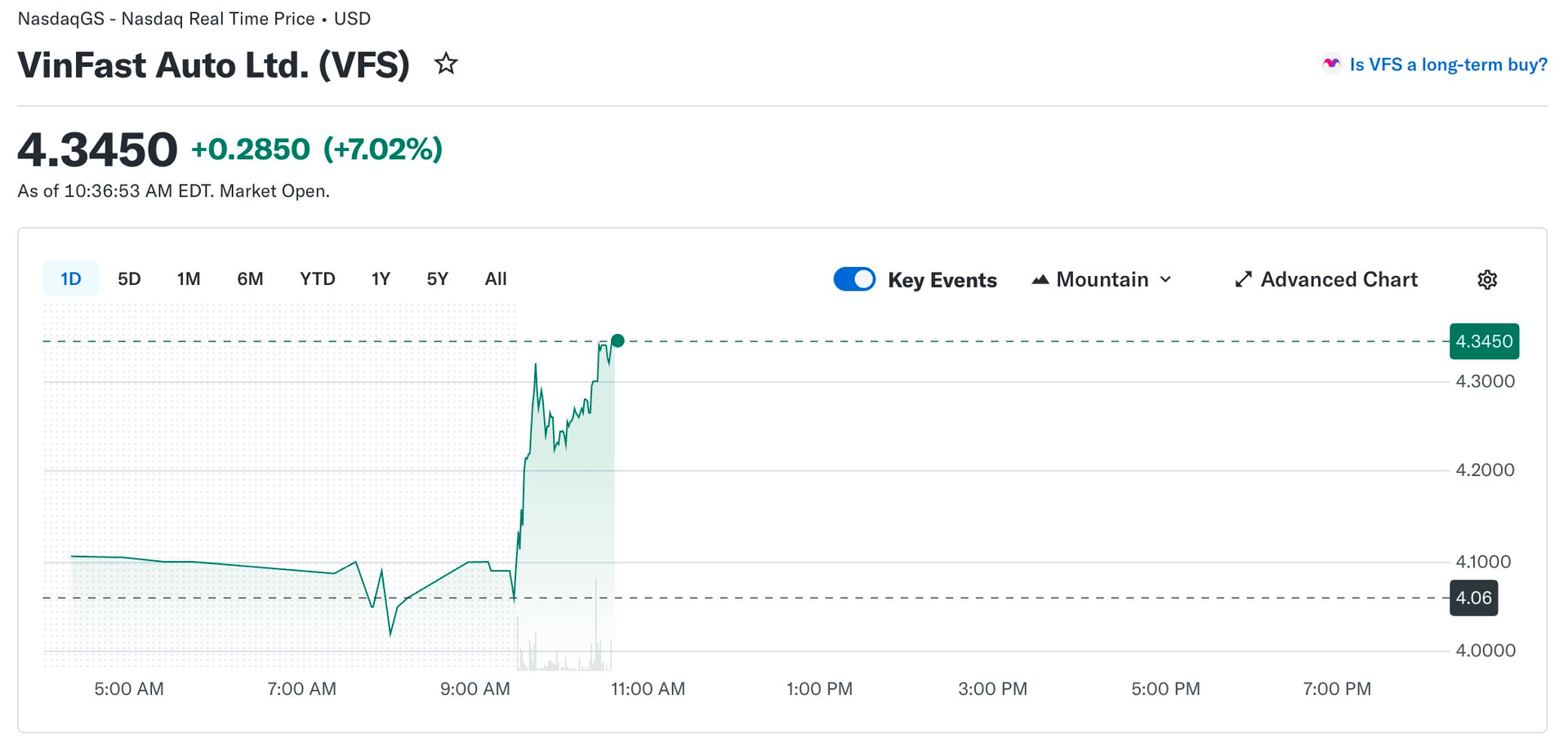 Trên sàn Nasdaq, cổ phiếu VFS sáng 10/4 theo giờ Mỹ tăng 7% lên mức 4,35 USD/cp, tăng 38% trong vòng 1 tháng qua. Vốn hoá thị trường đạt hơn 10 tỷ USD.
