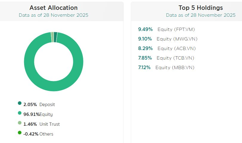 Trong danh sách 5 khoản đầu tư lớn nhất (Top 5 Holdings), cổ phiếu FPT vẫn chiếm tỷ trọng cao nhất với 9,49%. Đối với nhóm ngân hàng và bán lẻ, danh mục ghi nhận sự thay đổi khi Công ty Cổ phần Đầu tư Thế giới Di động (MWG) vươn lên vị trí thứ hai với 9,10%. Các vị trí tiếp theo thuộc về Ngân hàng Á Châu (ACB - 8,29%), Techcombank (TCB - 7,85%) và Ngân hàng Quân đội (MBB - 7,12%).