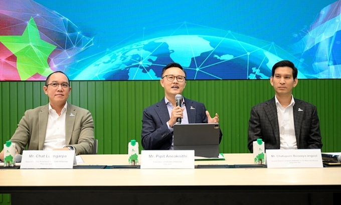 C hủ tịch KBank Pipit Aneaknithi (ngồi giữa) và Phó chủ tịch KBank Chat Luangarpa (bên trái) chia sẻ tham vọng đầu tư tại Việt Nam. Ảnh: KB