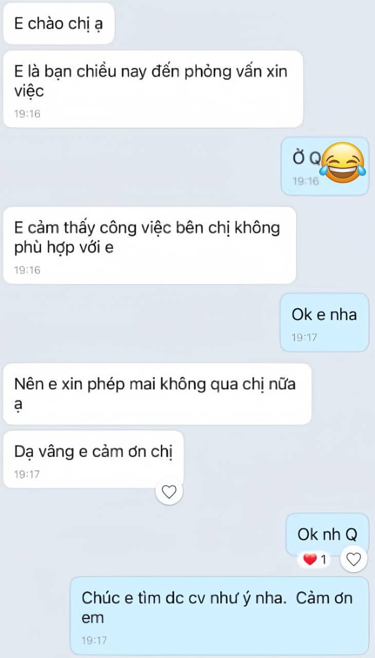 - Mình thấy bình thường mà, còn nhắn thêm chúc ứng viên tìm được việc phù hợp nữa, đâu có gì căng.