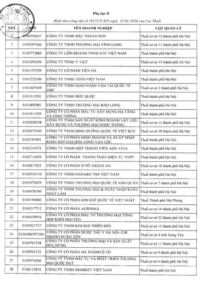 Tại TP Hà Nội, một số doanh nghiệp sẽ được cơ quan thuế tiến hành kiểm tra như Công ty TNHH ToTo Việt Nam, Công ty liên doanh TNHH KFC Việt Nam, Công ty cổ phần ô tô Thành An, Công ty Cổ phần di chuyển Xanh và Thông minh GSM…