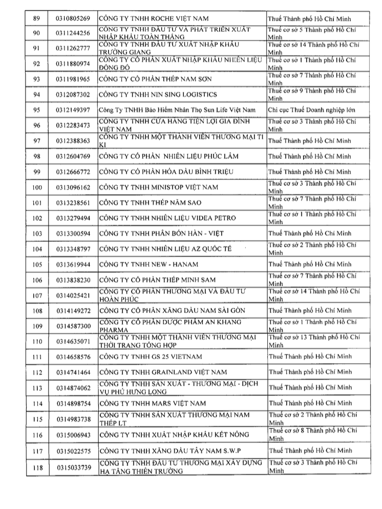 Tại TP. HCM, danh sách có một số doanh nghiệp như Công ty Cổ phần Be Group, Công ty TNHH Lotteria Việt Nam, Công ty TNHH Mercedes – Benz Việt Nam, Công ty Cổ phần Thương mại Nguyễn Kim, Công ty Cổ phần tập đoàn VNG, Công ty TNHH Petro – SG, Công ty TNHH Thép Tung – Ho Việt Nam, Công ty TNHH Bia Anheuser-Busch Inbev Việt Nam…