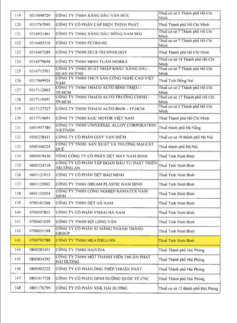 Thuế tỉnh Ninh Bình cũng sẽ có kế hoạch kiểm tra đối với các doanh nghiệp như Công ty cổ phần Dệt may Nam Định, Công ty Cổ phần Dệt Bảo Minh, Công ty Cổ phần Vissai Hà Nam, Công ty TNHH MeatDeli HN...