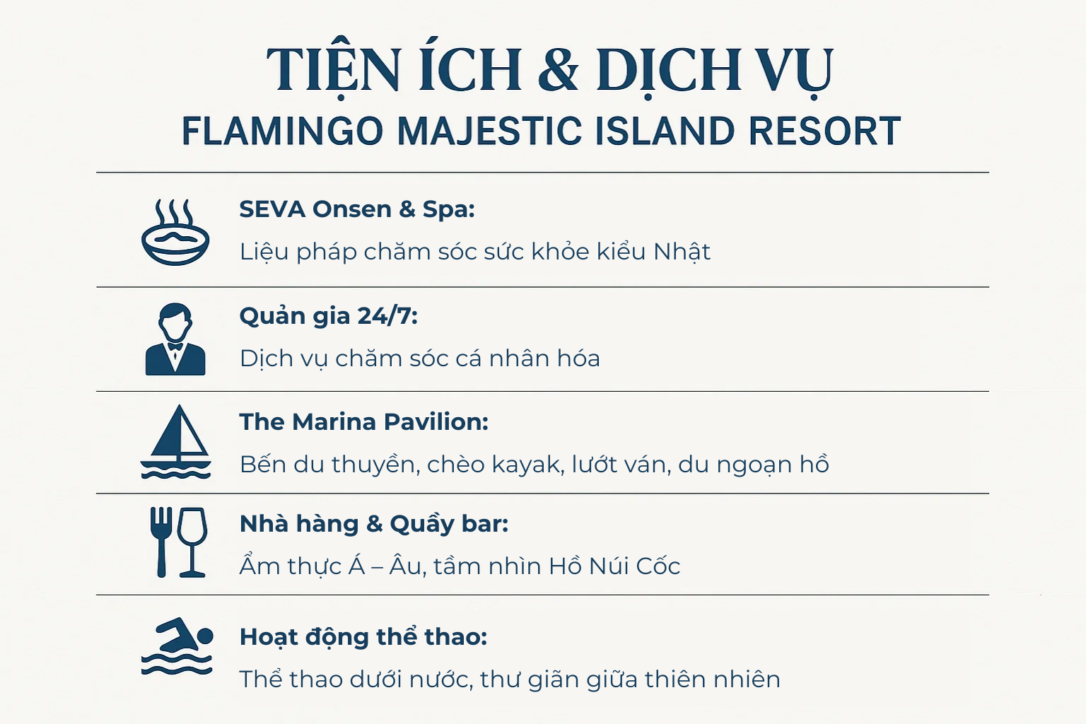Không chỉ có cảnh quan, Flamingo Majestic Island Resort còn đầu tư mạnh vào tiện ích. Du khách có thể thư giãn tại SEVA Onsen & Spa với liệu pháp chăm sóc sức khỏe kết hợp phong cách Nhật Bản, tận hưởng dịch vụ quản gia 24/7 hay trải nghiệm The Marina Pavilion – bến du thuyền bên hồ cho phép chèo kayak, lướt ván hoặc du ngoạn giữa mặt nước. Hệ thống nhà hàng và quầy bar phong cách Á – Âu cũng được xây dựng, đem đến trải nghiệm ẩm thực phong phú cùng tầm nhìn đẹp ra hồ Núi Cốc.