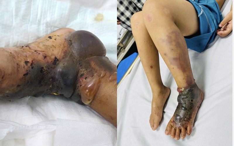 Tại Khoa Nhi, các bác sĩ tiếp nhận bệnh nhi trong tình trạng: Suy hô hấp, bàn - mu bàn chân trái sưng nề, nóng đỏ, có những phần thâm đen, hoại tử, có nhiều di vật lá cây thuốc nam đắp trên vết thương, vùng sưng đã lan lên cẳng chân trái. Cháu được chẩn đoán nhiễm khuẩn huyết nặng, suy gan, suy thận, rối loạn đông máu nặng và viêm mô bào nặng vùng mu bàn và cẳng chân trái, kèm nổi nhiều bọng nước kích thước khoảng 5x5cm.