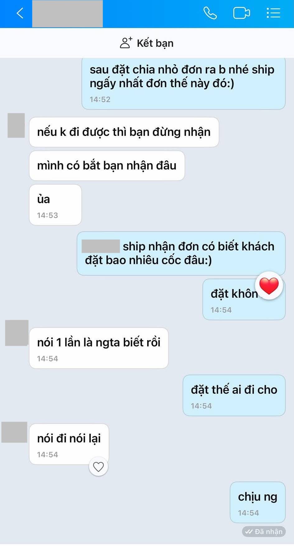 Nam shipper liền tỏ ý không hài lòng, vì khối lượng lớn, lại yêu cầu note tên từng người,... anh nhắn tin lại cho khách hàng: "Sau đặt chia nhỏ đơn ra bạn nhé, ship ngấy nhất đơn này đó".