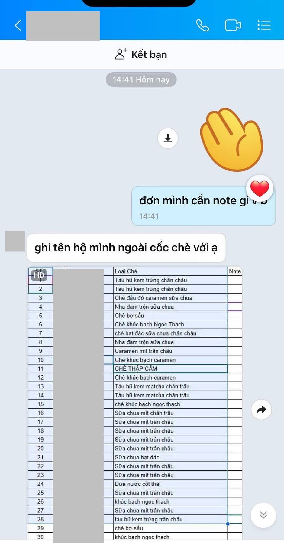 "Ghi tên hộ mình ngoài cốc chè với ạ", T.T nhắn.