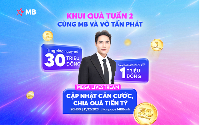 Phiên livestream trao thưởng tuần 2 diễn ra vào 20h00 ngày 11/12/2024 trên fanpage MBBank với sự dẫn dắt của Võ Tấn Phát. Với tổng giải thưởng 500 triệu đồng, sự kiện không chỉ là tìm ra những chủ nhân may mắn mà còn mang đến các phần giải trí sôi động với cơ hội nhận quà "nóng" cực khủng cho người tham dự.