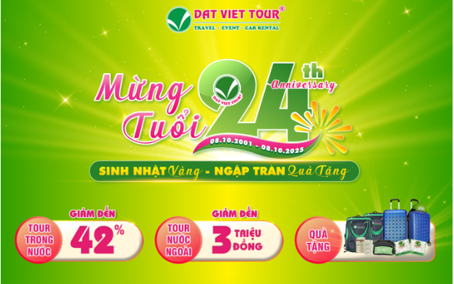 Chương trình ưu đãi mừng sinh nhật 24 năm của Đất Việt Tour không chỉ mang đến giá tour tốt chưa từng có, mà còn kèm theo nhiều phần quà giá trị, voucher nghỉ dưỡng cao cấp và quà tặng tri ân dành cho khách hàng. Đây vừa là dịp tri ân sâu sắc, vừa là lời hứa hẹn cho hành trình phía trước, mang đến thêm nhiều chương trình hấp dẫn, dịch vụ chất lượng và trải nghiệm trọn vẹn hơn nữa cho du khách trên mọi hành trình.