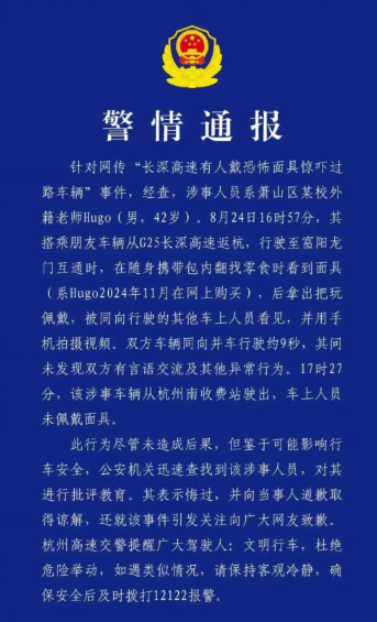 Một giáo viên nước ngoài đang giảng dạy tại Trung Quốc đã chính thức lên tiếng xin lỗi sau khi gây xôn xao mạng xã hội vì hành động đeo mặt nạ kinh dị khi ngồi trong xe ô tô trên đường cao tốc đông đúc gần thành phố Hàng Châu, tỉnh Chiết Giang.