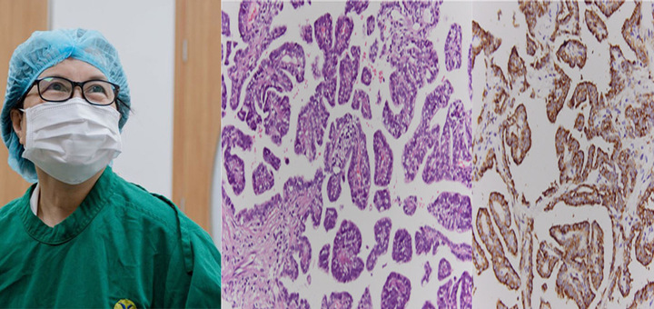 Dưới sự chỉ đạo của PGS.TS Hoàng Thị Phượng, Chuyên khoa Hô hấp, chuyên gia cao cấp của Hệ thống Y tế MEDLATEC, người bệnh được sinh thiết tổn thương phổi dưới hướng dẫn của CT. Kết quả mô bệnh học và hóa mô miễn dịch xác định đây là ung thư biểu mô tuyến nhú của phổi. Các tế bào u dương tính với các dấu ấn TTF-1, Napsin A và CK7.