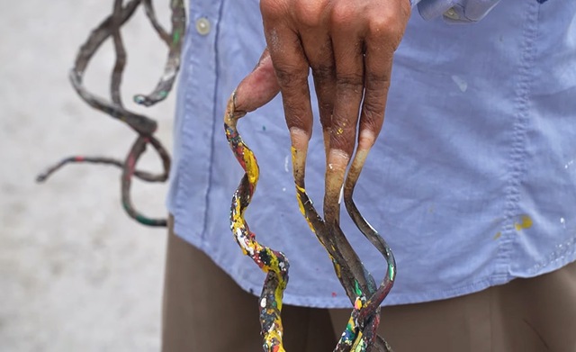 Sợ gãy nên 33 năm qua, ông Huyền không bao giờ rửa tay, khiến những chiếc móng bám đầy bụi bẩn, xi măng, màu mực,... do ông làm nghề vẽ tranh, đắp phù điêu. Ông Huyền bảo, chỉ cần bộ móng tay này bị nhúng vào nước một lúc thì sẽ bị mềm ra rồi gãy.