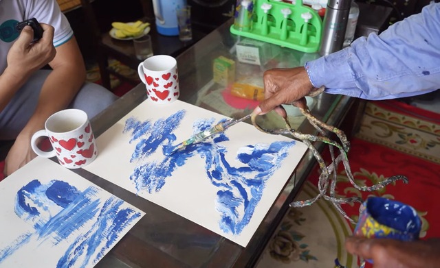 Dù nuôi móng tay dài như vậy nhưng ông Huyền làm công việc của mình rất khéo léo. Ông vẽ một bức tranh phong cảnh chỉ trong vòng 1 phút. Ông cũng là tác giả của nhiều tác phẩm đắp, vẽ hoa văn ở đình, chùa địa phương.