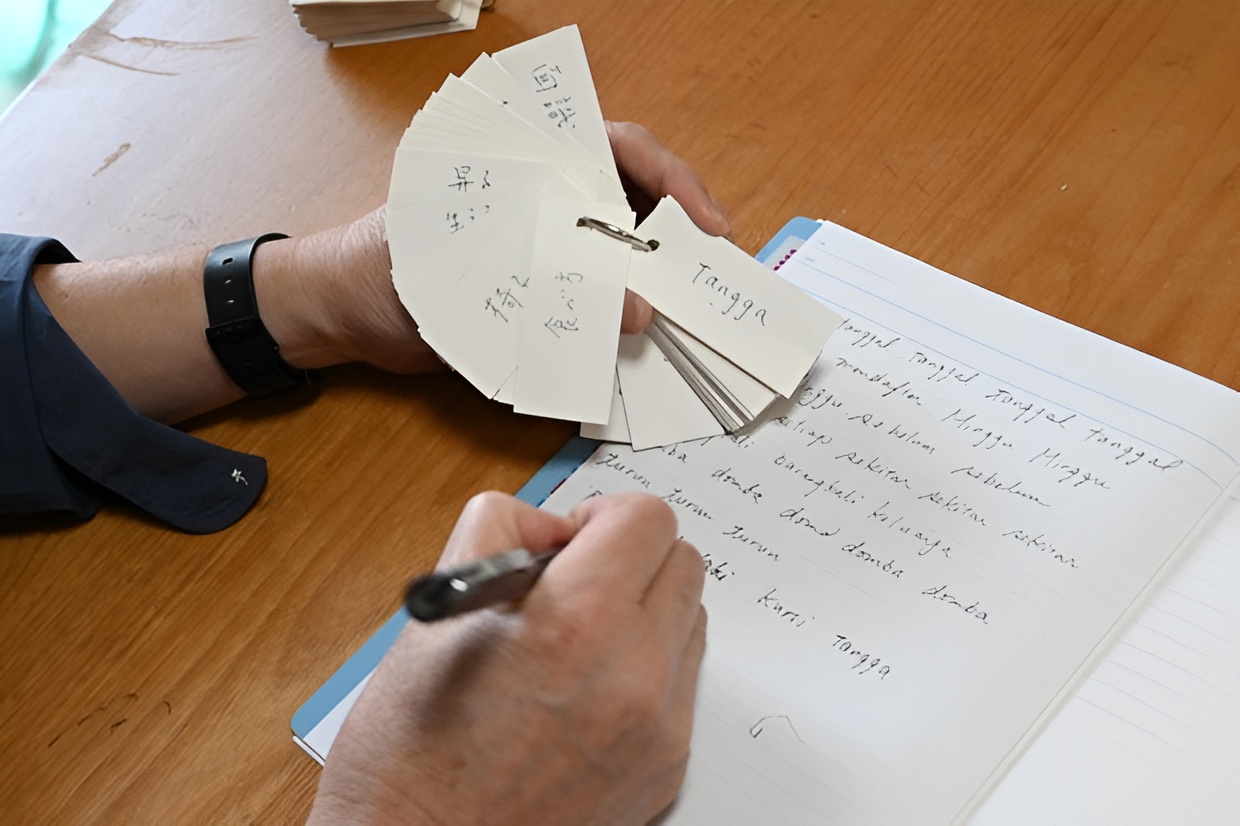 “Kursi” (ghế), “tangga” (cầu thang),… là những từ tiếng Indonesia được ông Shinji Miyazaki ghi trên những tấm thẻ từ vựng tự làm. Đây là ngôn ngữ ông mới bắt đầu học từ năm ngoái.