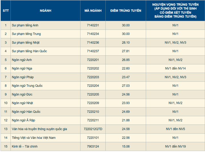 Trường Đại học Ngoại ngữ dẫn đầu điểm chuẩn các trường thành viên Đại học Quốc gia Hà Nội với 30 điểm, ở ngành Sư phạm tiếng Anh và tiếng Trung.