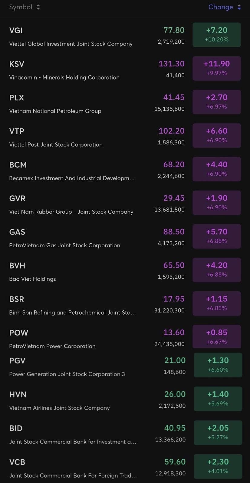 Cùng xu hướng, BVH (Tập đoàn Bảo Việt) cũng có phiên tăng trần thứ hai, chốt tại 65.500 đồng/cp - mức cao nhất 5 năm. Đà hưng phấn còn kéo theo hàng loạt "ông lớn" như KSV (tăng trần phiên thứ 4), GVR, BSR, PLX hay BCM đồng loạt tăng hết biên độ.