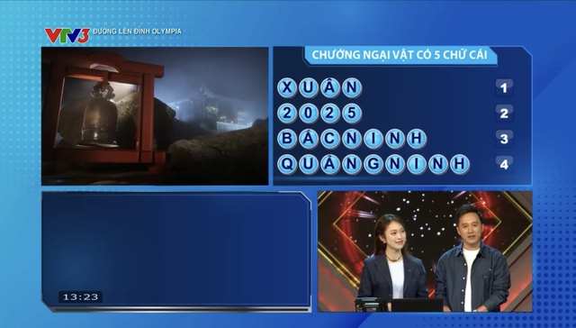 Bước sang phần thi Vượt chướng ngại vật, Bảo Khánh tiếp tục thể hiện bản lĩnh khi nhanh chóng tìm ra đáp án “Yên Tử” chỉ sau khi hai từ hàng ngang được lật mở. Với câu trả lời chính xác này, Bảo Khánh củng cố vững chắc vị trí dẫn đầu, nâng tổng điểm lên 115, tạo cách biệt 50 điểm so với thí sinh đang tạm xếp thứ hai.