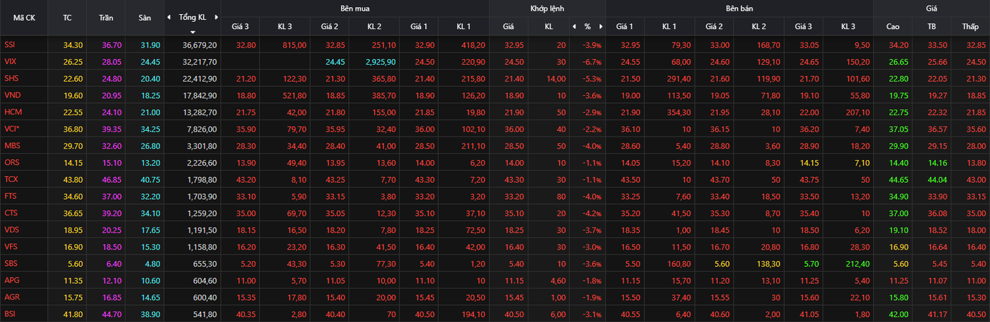 Nhóm bất động sản đồng loạt lao dốc, nhiều mã giảm trên 4% như DXS, SCR, DXG, KDH, HPX, KBC… Cổ phiếu chứng khoán giảm sâu, toàn bộ ngập trong sắc đỏ. VIX giảm sát giá sàn, SSI, SHS, VND, HCM, VCI, MBS chìm trong sắc đỏ.