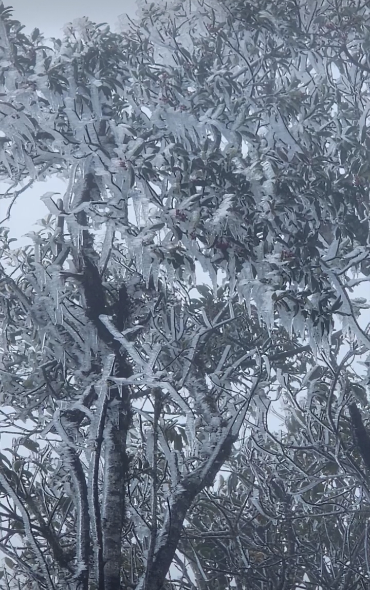 Anh Phàng A Chìa (người làm nghề khuân vác hành lý và dẫn đoàn leo núi) cho biết, khoảng 9h, khi đang hỗ trợ đoàn khách chinh phục đỉnh núi, anh nhận thấy lớp băng bám trên cành cây, ngọn cỏ và lan xuống cả mặt đường ở độ cao khoảng 2.600 m.
